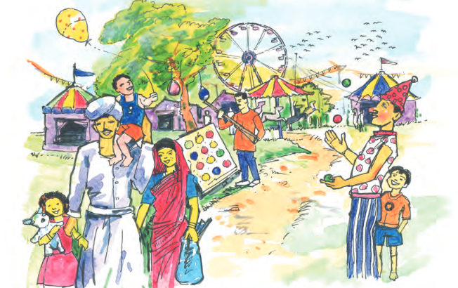 I can see a picture of a fair. It is held on a big ground. The ground is crowded with many villagers. They are enjoying the fair. I can see a giant wheel in this picture. There is also a merry-go-round for children. I can see many shops and counters in the ground. One balloon seller is selling clourful balloons. One juggler is juggling the balls. At the left side of the picture I can see a family is returning from the fair with his wife and two children. The little girl is holding a teddy and the little boy is sitting on his father’s shoulder. Overall this is a beautiful picture.